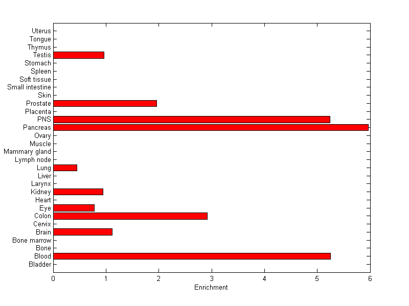 The expression level is normalized with tissue-library size. Each value for a gene in a tissue is a ratio of observed ESTs to the expected one in this tissue. The expected number of ESTs is the product of total ESTs of the gene and the fraction of total ESTs in the tissue among all ESTs in 30 tissues.