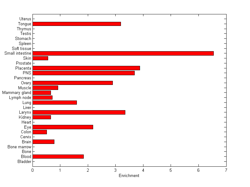 The expression level is normalized with tissue-library size. Each value for a gene in a tissue is a ratio of observed ESTs to the expected one in this tissue. The expected number of ESTs is the product of total ESTs of the gene and the fraction of total ESTs in the tissue among all ESTs in 30 tissues.