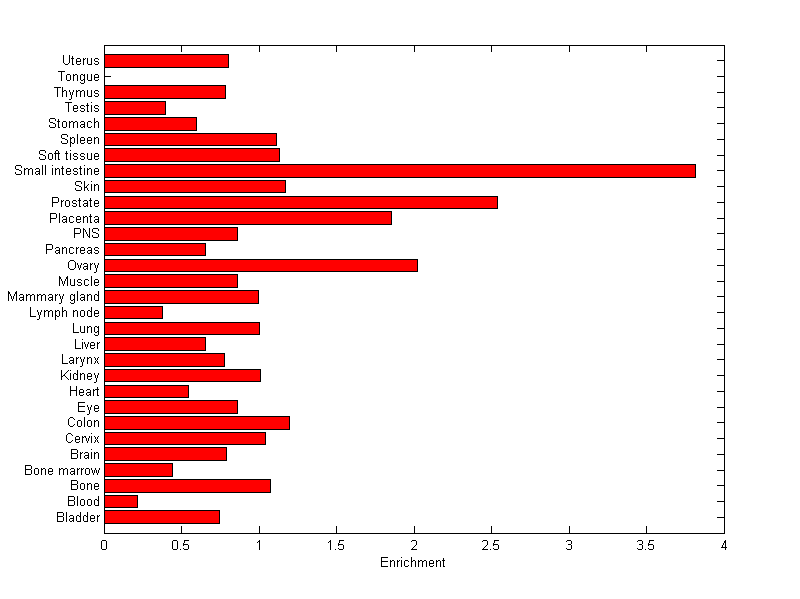 The expression level is normalized with tissue-library size. Each value for a gene in a tissue is a ratio of observed ESTs to the expected one in this tissue. The expected number of ESTs is the product of total ESTs of the gene and the fraction of total ESTs in the tissue among all ESTs in 30 tissues.