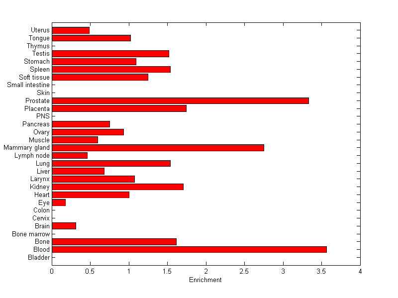The expression level is normalized with tissue-library size. Each value for a gene in a tissue is a ratio of observed ESTs to the expected one in this tissue. The expected number of ESTs is the product of total ESTs of the gene and the fraction of total ESTs in the tissue among all ESTs in 30 tissues.
