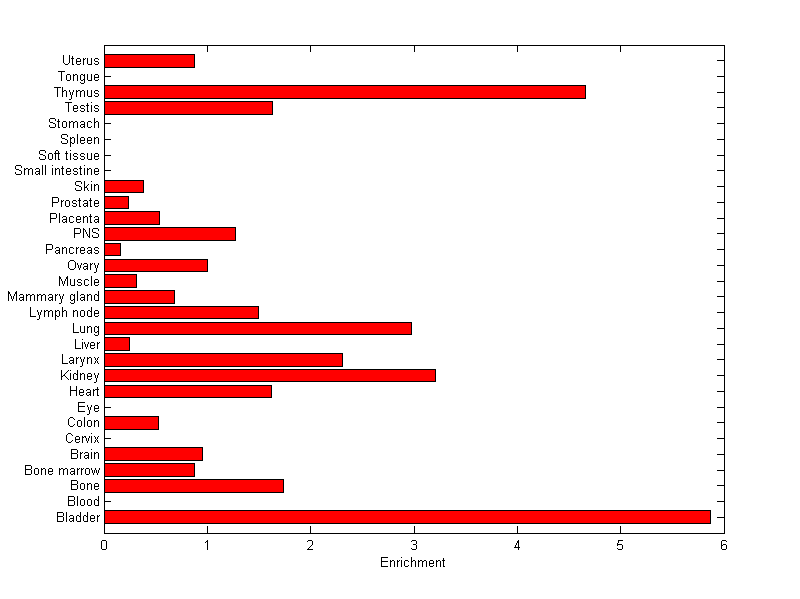 The expression level is normalized with tissue-library size. Each value for a gene in a tissue is a ratio of observed ESTs to the expected one in this tissue. The expected number of ESTs is the product of total ESTs of the gene and the fraction of total ESTs in the tissue among all ESTs in 30 tissues.
