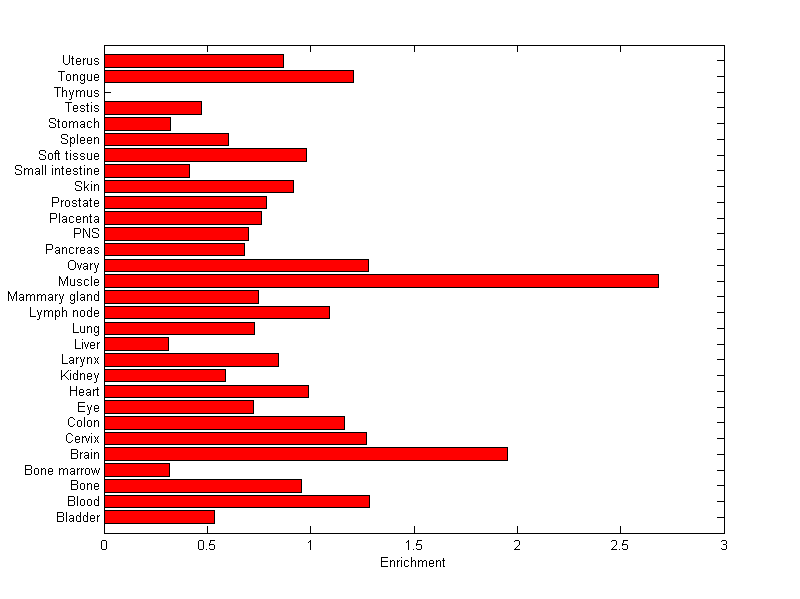 The expression level is normalized with tissue-library size. Each value for a gene in a tissue is a ratio of observed ESTs to the expected one in this tissue. The expected number of ESTs is the product of total ESTs of the gene and the fraction of total ESTs in the tissue among all ESTs in 30 tissues.
