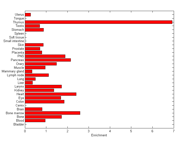 The expression level is normalized with tissue-library size. Each value for a gene in a tissue is a ratio of observed ESTs to the expected one in this tissue. The expected number of ESTs is the product of total ESTs of the gene and the fraction of total ESTs in the tissue among all ESTs in 30 tissues.