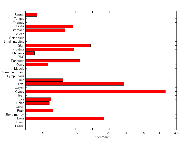 The expression level is normalized with tissue-library size. Each value for a gene in a tissue is a ratio of observed ESTs to the expected one in this tissue. The expected number of ESTs is the product of total ESTs of the gene and the fraction of total ESTs in the tissue among all ESTs in 30 tissues.