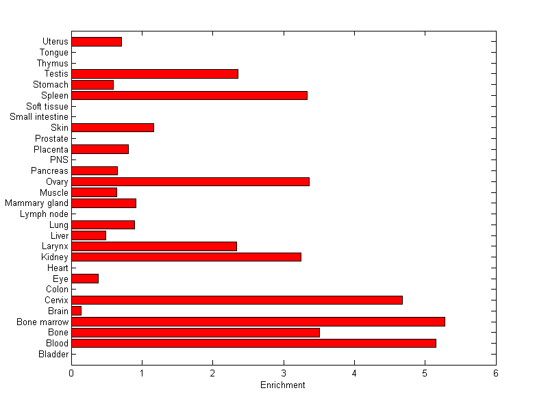 The expression level is normalized with tissue-library size. Each value for a gene in a tissue is a ratio of observed ESTs to the expected one in this tissue. The expected number of ESTs is the product of total ESTs of the gene and the fraction of total ESTs in the tissue among all ESTs in 30 tissues.