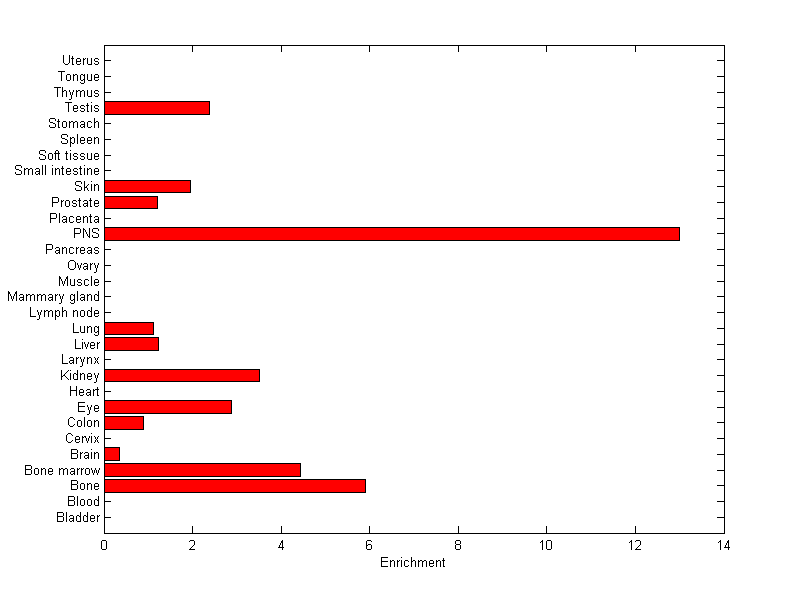 The expression level is normalized with tissue-library size. Each value for a gene in a tissue is a ratio of observed ESTs to the expected one in this tissue. The expected number of ESTs is the product of total ESTs of the gene and the fraction of total ESTs in the tissue among all ESTs in 30 tissues.