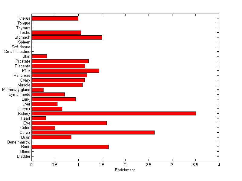 The expression level is normalized with tissue-library size. Each value for a gene in a tissue is a ratio of observed ESTs to the expected one in this tissue. The expected number of ESTs is the product of total ESTs of the gene and the fraction of total ESTs in the tissue among all ESTs in 30 tissues.