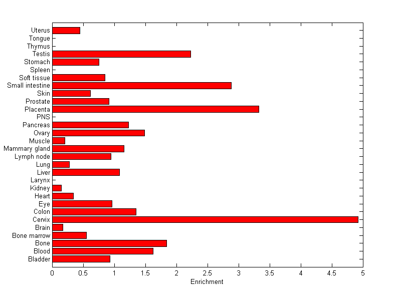 The expression level is normalized with tissue-library size. Each value for a gene in a tissue is a ratio of observed ESTs to the expected one in this tissue. The expected number of ESTs is the product of total ESTs of the gene and the fraction of total ESTs in the tissue among all ESTs in 30 tissues.