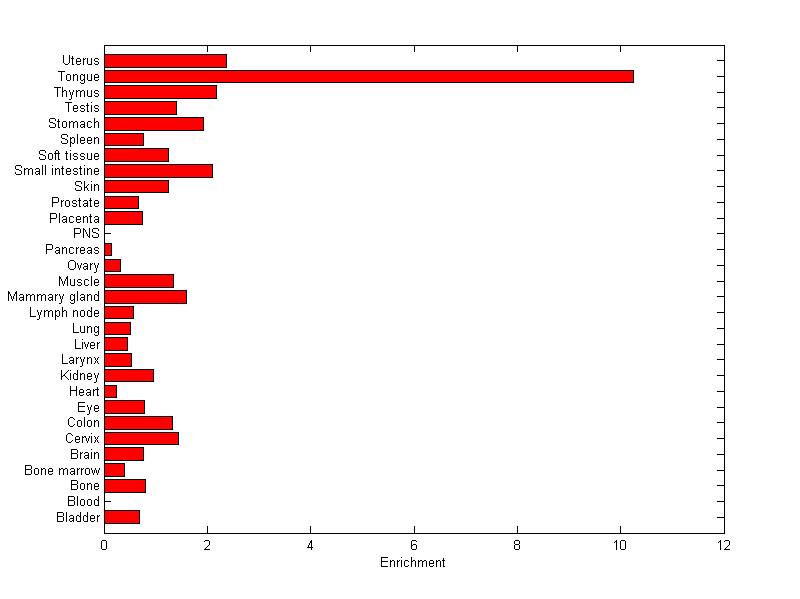 The expression level is normalized with tissue-library size. Each value for a gene in a tissue is a ratio of observed ESTs to the expected one in this tissue. The expected number of ESTs is the product of total ESTs of the gene and the fraction of total ESTs in the tissue among all ESTs in 30 tissues.