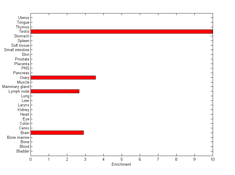 The expression level is normalized with tissue-library size. Each value for a gene in a tissue is a ratio of observed ESTs to the expected one in this tissue. The expected number of ESTs is the product of total ESTs of the gene and the fraction of total ESTs in the tissue among all ESTs in 30 tissues.