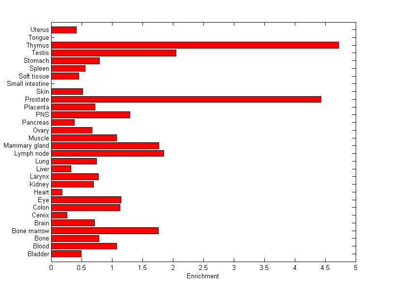 The expression level is normalized with tissue-library size. Each value for a gene in a tissue is a ratio of observed ESTs to the expected one in this tissue. The expected number of ESTs is the product of total ESTs of the gene and the fraction of total ESTs in the tissue among all ESTs in 30 tissues.