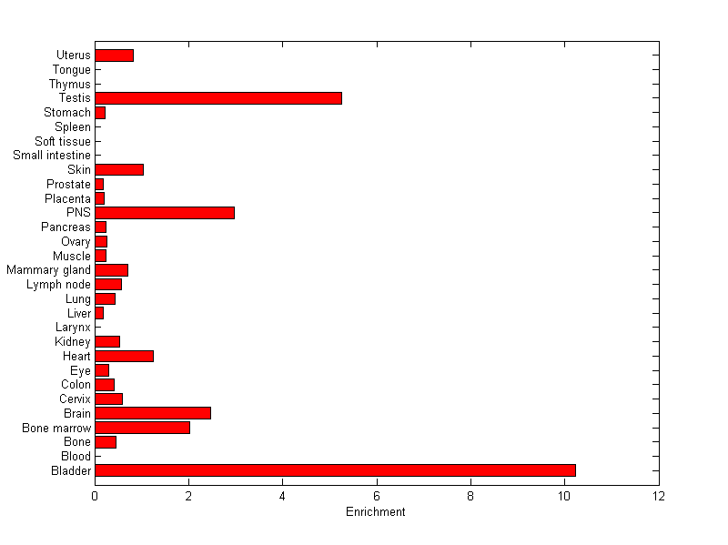 About the profile: The expression level is normalized with tissue-library size. Each value for a gene in a tissue is a ratio of observed ESTs to the expected one in this tissue. The expected number of ESTs is the product of total ESTs of the gene and the fraction of total ESTs in the tissue among all ESTs in 30 tissues. Summary: This gene is preferentially expressed in [bladder, testis] Download: |