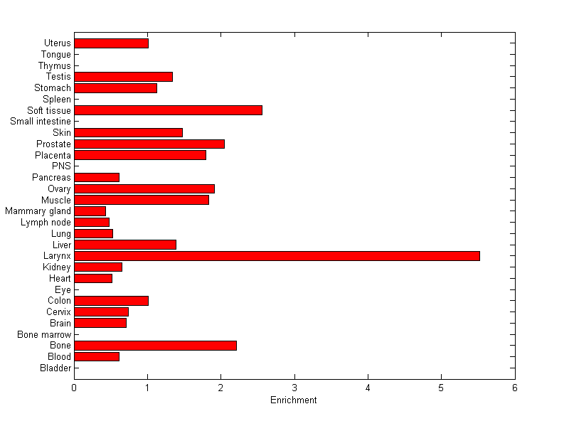 The expression level is normalized with tissue-library size. Each value for a gene in a tissue is a ratio of observed ESTs to the expected one in this tissue. The expected number of ESTs is the product of total ESTs of the gene and the fraction of total ESTs in the tissue among all ESTs in 30 tissues.