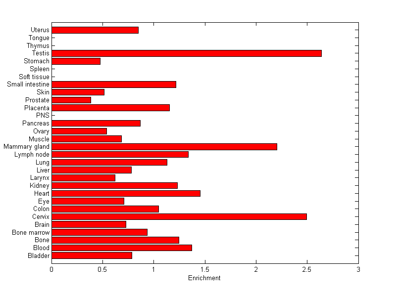 The expression level is normalized with tissue-library size. Each value for a gene in a tissue is a ratio of observed ESTs to the expected one in this tissue. The expected number of ESTs is the product of total ESTs of the gene and the fraction of total ESTs in the tissue among all ESTs in 30 tissues.