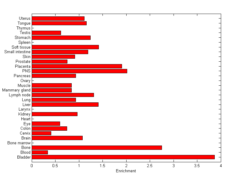 The expression level is normalized with tissue-library size. Each value for a gene in a tissue is a ratio of observed ESTs to the expected one in this tissue. The expected number of ESTs is the product of total ESTs of the gene and the fraction of total ESTs in the tissue among all ESTs in 30 tissues.