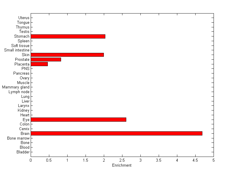 The expression level is normalized with tissue-library size. Each value for a gene in a tissue is a ratio of observed ESTs to the expected one in this tissue. The expected number of ESTs is the product of total ESTs of the gene and the fraction of total ESTs in the tissue among all ESTs in 30 tissues.