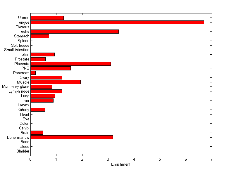 The expression level is normalized with tissue-library size. Each value for a gene in a tissue is a ratio of observed ESTs to the expected one in this tissue. The expected number of ESTs is the product of total ESTs of the gene and the fraction of total ESTs in the tissue among all ESTs in 30 tissues.