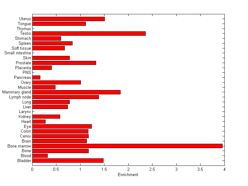 The expression level is normalized with tissue-library size. Each value for a gene in a tissue is a ratio of observed ESTs to the expected one in this tissue. The expected number of ESTs is the product of total ESTs of the gene and the fraction of total ESTs in the tissue among all ESTs in 30 tissues.