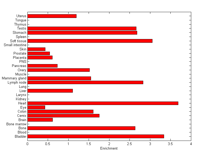 The expression level is normalized with tissue-library size. Each value for a gene in a tissue is a ratio of observed ESTs to the expected one in this tissue. The expected number of ESTs is the product of total ESTs of the gene and the fraction of total ESTs in the tissue among all ESTs in 30 tissues.