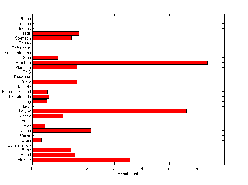 About the profile: The expression level is normalized with tissue-library size. Each value for a gene in a tissue is a ratio of observed ESTs to the expected one in this tissue. The expected number of ESTs is the product of total ESTs of the gene and the fraction of total ESTs in the tissue among all ESTs in 30 tissues. Summary: This gene is preferentially expressed in [prostate] Download: |
