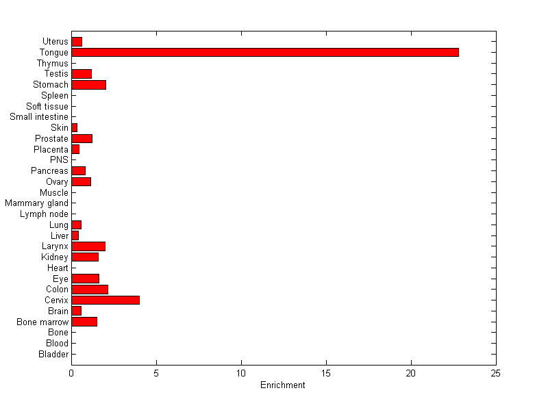 About the profile: The expression level is normalized with tissue-library size. Each value for a gene in a tissue is a ratio of observed ESTs to the expected one in this tissue. The expected number of ESTs is the product of total ESTs of the gene and the fraction of total ESTs in the tissue among all ESTs in 30 tissues. Summary: This gene is preferentially expressed in [tongue] Download: |