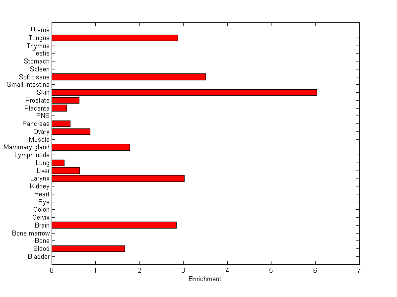 The expression level is normalized with tissue-library size. Each value for a gene in a tissue is a ratio of observed ESTs to the expected one in this tissue. The expected number of ESTs is the product of total ESTs of the gene and the fraction of total ESTs in the tissue among all ESTs in 30 tissues.