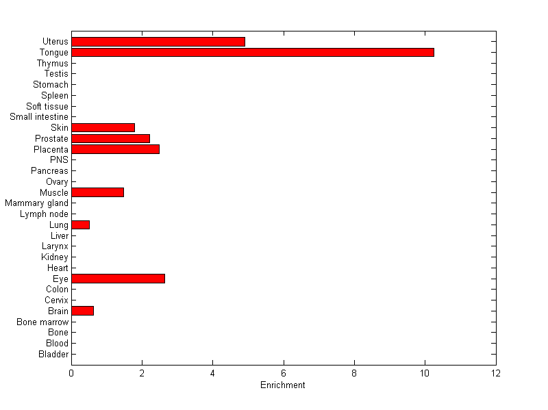 The expression level is normalized with tissue-library size. Each value for a gene in a tissue is a ratio of observed ESTs to the expected one in this tissue. The expected number of ESTs is the product of total ESTs of the gene and the fraction of total ESTs in the tissue among all ESTs in 30 tissues.