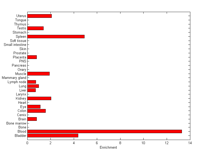 The expression level is normalized with tissue-library size. Each value for a gene in a tissue is a ratio of observed ESTs to the expected one in this tissue. The expected number of ESTs is the product of total ESTs of the gene and the fraction of total ESTs in the tissue among all ESTs in 30 tissues.