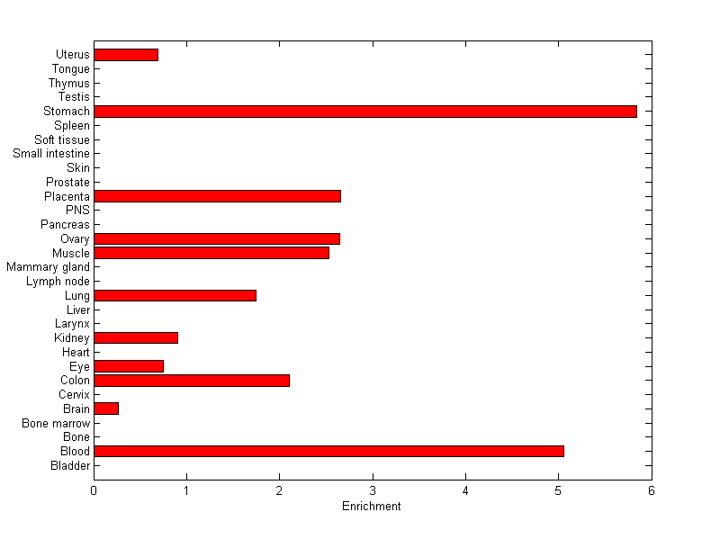The expression level is normalized with tissue-library size. Each value for a gene in a tissue is a ratio of observed ESTs to the expected one in this tissue. The expected number of ESTs is the product of total ESTs of the gene and the fraction of total ESTs in the tissue among all ESTs in 30 tissues.