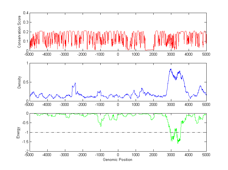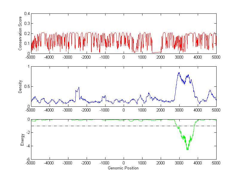 The energy profile (green curve) is about energy for module detection based on TF interaction. The positions with energy less than -1 indicate the existence of CRMs.