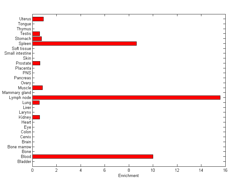The expression level is normalized with tissue-library size. Each value for a gene in a tissue is a ratio of observed ESTs to the expected one in this tissue. The expected number of ESTs is the product of total ESTs of the gene and the fraction of total ESTs in the tissue among all ESTs in 30 tissues.