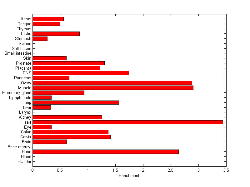 The expression level is normalized with tissue-library size. Each value for a gene in a tissue is a ratio of observed ESTs to the expected one in this tissue. The expected number of ESTs is the product of total ESTs of the gene and the fraction of total ESTs in the tissue among all ESTs in 30 tissues.