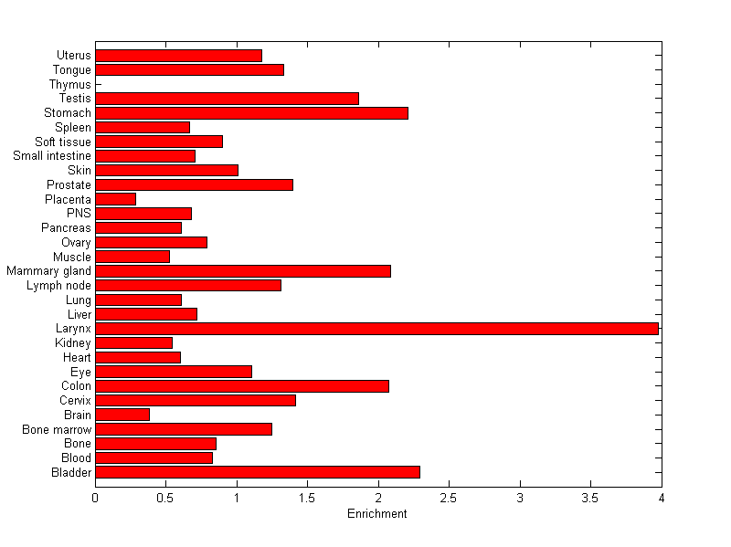 The expression level is normalized with tissue-library size. Each value for a gene in a tissue is a ratio of observed ESTs to the expected one in this tissue. The expected number of ESTs is the product of total ESTs of the gene and the fraction of total ESTs in the tissue among all ESTs in 30 tissues.