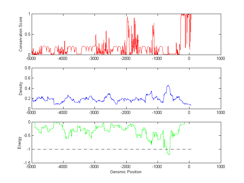 The energy profile (green curve) is about energy for module detection based on TF interaction. The positions with energy less than -1 indicate the existence of CRMs.