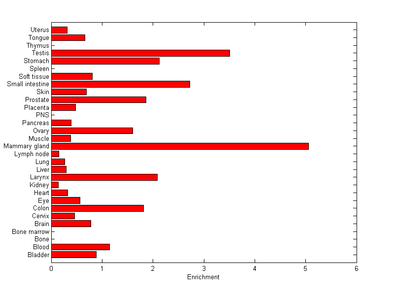 The expression level is normalized with tissue-library size. Each value for a gene in a tissue is a ratio of observed ESTs to the expected one in this tissue. The expected number of ESTs is the product of total ESTs of the gene and the fraction of total ESTs in the tissue among all ESTs in 30 tissues.
