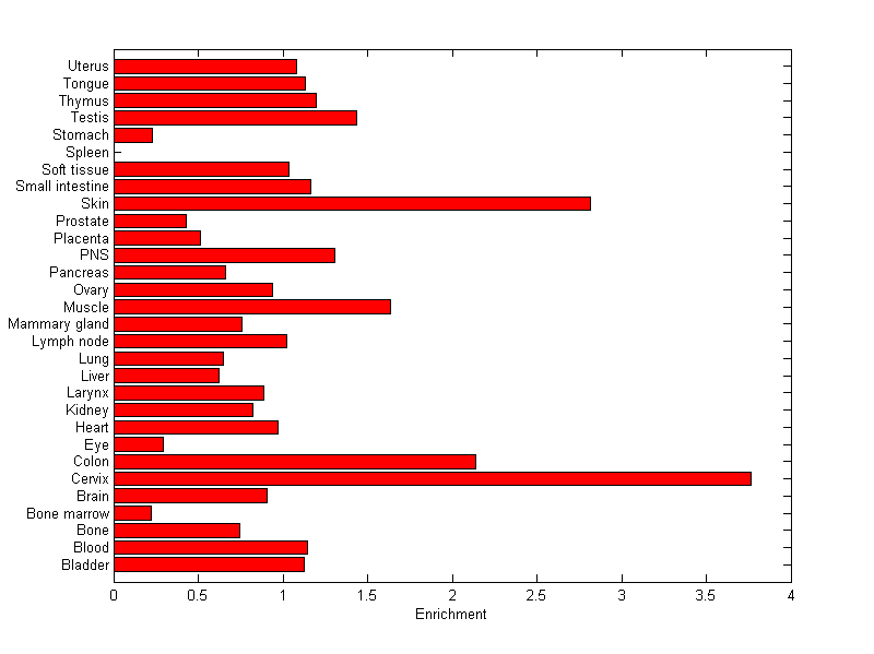 The expression level is normalized with tissue-library size. Each value for a gene in a tissue is a ratio of observed ESTs to the expected one in this tissue. The expected number of ESTs is the product of total ESTs of the gene and the fraction of total ESTs in the tissue among all ESTs in 30 tissues.