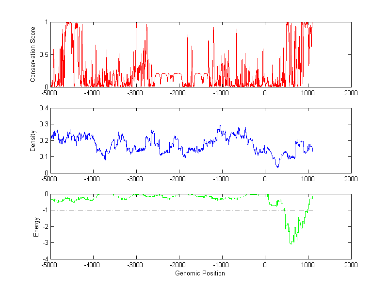 The energy profile (green curve) is about energy for module detection based on TF interaction. The positions with energy less than -1 indicate the existence of CRMs.
