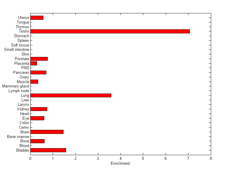 The expression level is normalized with tissue-library size. Each value for a gene in a tissue is a ratio of observed ESTs to the expected one in this tissue. The expected number of ESTs is the product of total ESTs of the gene and the fraction of total ESTs in the tissue among all ESTs in 30 tissues.