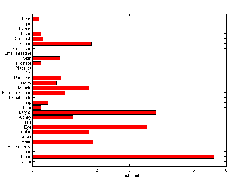 The expression level is normalized with tissue-library size. Each value for a gene in a tissue is a ratio of observed ESTs to the expected one in this tissue. The expected number of ESTs is the product of total ESTs of the gene and the fraction of total ESTs in the tissue among all ESTs in 30 tissues.