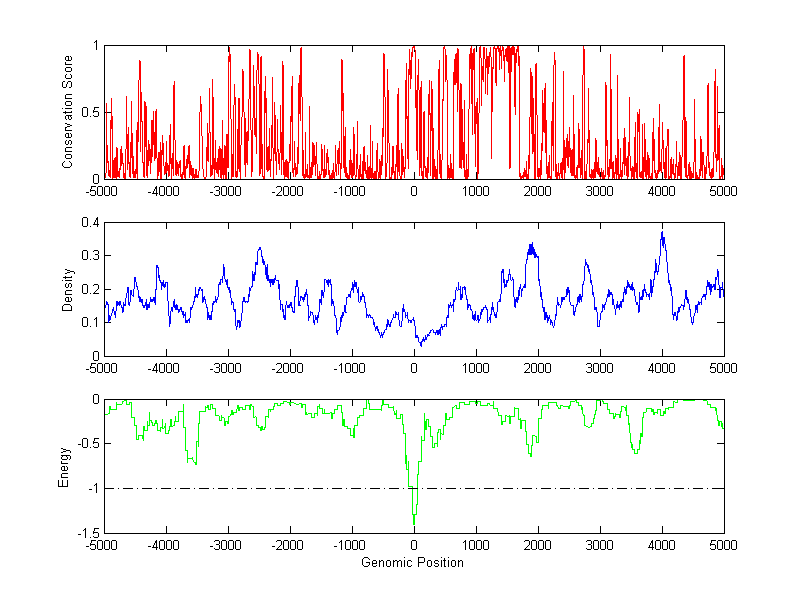 The energy profile (green curve) is about energy for module detection based on TF interaction. The positions with energy less than -1 indicate the existence of CRMs.