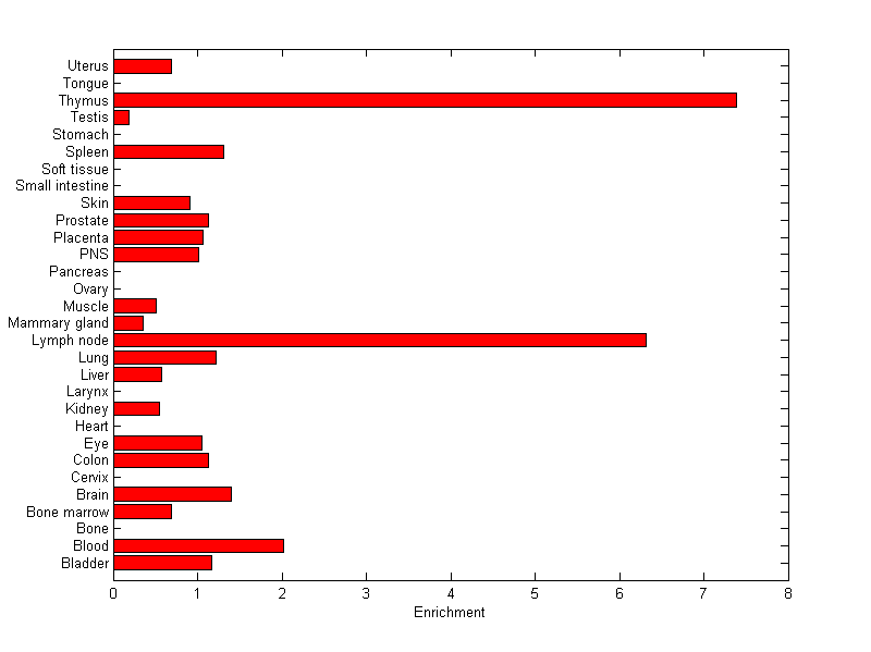 The expression level is normalized with tissue-library size. Each value for a gene in a tissue is a ratio of observed ESTs to the expected one in this tissue. The expected number of ESTs is the product of total ESTs of the gene and the fraction of total ESTs in the tissue among all ESTs in 30 tissues.