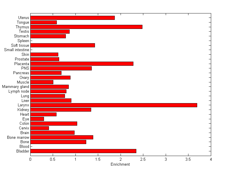 The expression level is normalized with tissue-library size. Each value for a gene in a tissue is a ratio of observed ESTs to the expected one in this tissue. The expected number of ESTs is the product of total ESTs of the gene and the fraction of total ESTs in the tissue among all ESTs in 30 tissues.