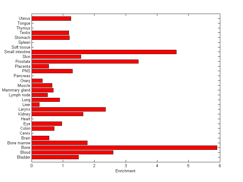 About the profile: The expression level is normalized with tissue-library size. Each value for a gene in a tissue is a ratio of observed ESTs to the expected one in this tissue. The expected number of ESTs is the product of total ESTs of the gene and the fraction of total ESTs in the tissue among all ESTs in 30 tissues. Summary: This gene is preferentially expressed in [bone] Download: |