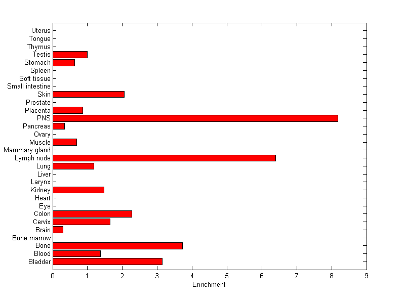 The expression level is normalized with tissue-library size. Each value for a gene in a tissue is a ratio of observed ESTs to the expected one in this tissue. The expected number of ESTs is the product of total ESTs of the gene and the fraction of total ESTs in the tissue among all ESTs in 30 tissues.