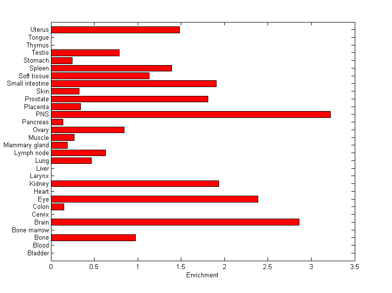 The expression level is normalized with tissue-library size. Each value for a gene in a tissue is a ratio of observed ESTs to the expected one in this tissue. The expected number of ESTs is the product of total ESTs of the gene and the fraction of total ESTs in the tissue among all ESTs in 30 tissues.