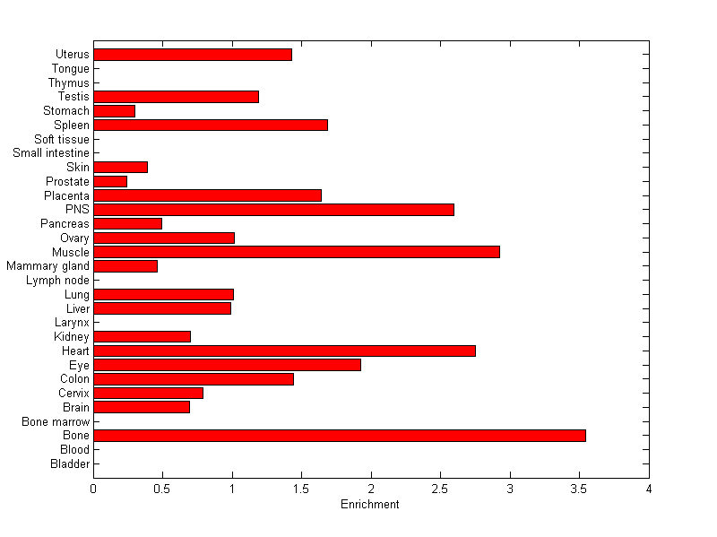 The expression level is normalized with tissue-library size. Each value for a gene in a tissue is a ratio of observed ESTs to the expected one in this tissue. The expected number of ESTs is the product of total ESTs of the gene and the fraction of total ESTs in the tissue among all ESTs in 30 tissues.