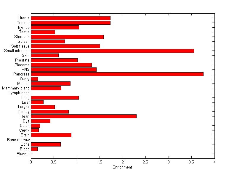 The expression level is normalized with tissue-library size. Each value for a gene in a tissue is a ratio of observed ESTs to the expected one in this tissue. The expected number of ESTs is the product of total ESTs of the gene and the fraction of total ESTs in the tissue among all ESTs in 30 tissues.