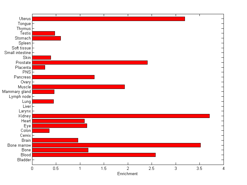 The expression level is normalized with tissue-library size. Each value for a gene in a tissue is a ratio of observed ESTs to the expected one in this tissue. The expected number of ESTs is the product of total ESTs of the gene and the fraction of total ESTs in the tissue among all ESTs in 30 tissues.
