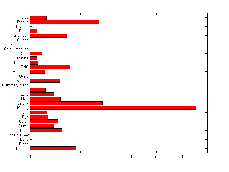 The expression level is normalized with tissue-library size. Each value for a gene in a tissue is a ratio of observed ESTs to the expected one in this tissue. The expected number of ESTs is the product of total ESTs of the gene and the fraction of total ESTs in the tissue among all ESTs in 30 tissues.