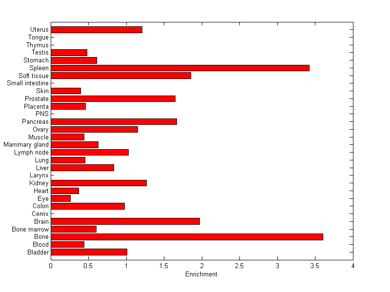 The expression level is normalized with tissue-library size. Each value for a gene in a tissue is a ratio of observed ESTs to the expected one in this tissue. The expected number of ESTs is the product of total ESTs of the gene and the fraction of total ESTs in the tissue among all ESTs in 30 tissues.